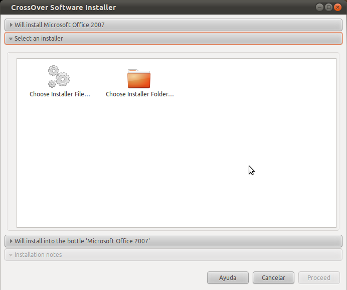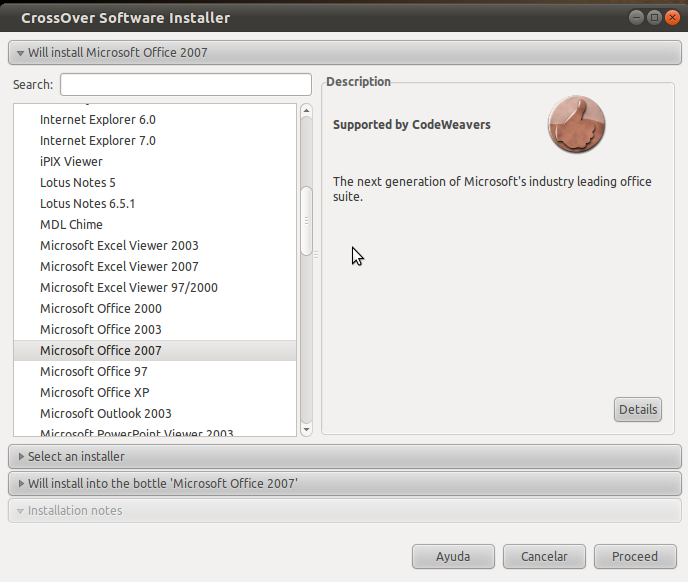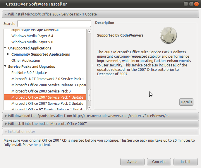 Ir a "Services Pack and Upgrades" en Crossover y seleccionar Office 2007 Service Pack 1